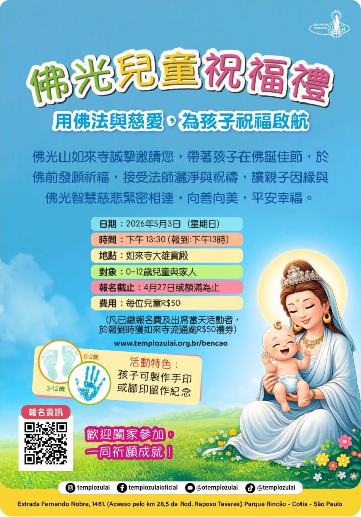 佛光山如來寺誠摯邀請您,帶著孩子在佛誕佳節,於佛前發願祈福,接受法師灑淨與祝禱,讓親子因緣與佛光智慧慈悲緊密相連,向善向美,平安幸福。